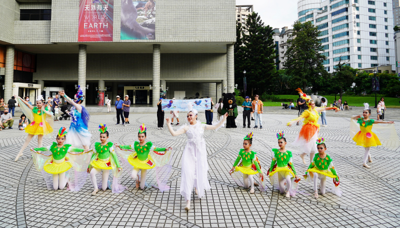 鳥博宣傳由臺中在地「培培動態藝術中心」帶來2場「羽語台灣」-以台灣野鳥為靈感的快閃舞蹈,3位舞者在默契的節奏中,透過身體語彙勾勒出自由、柔美與連結的飛行姿態,向台灣豐富的鳥類生態致敬,也邀請今日蒞臨科博館的大小朋友共舞。
