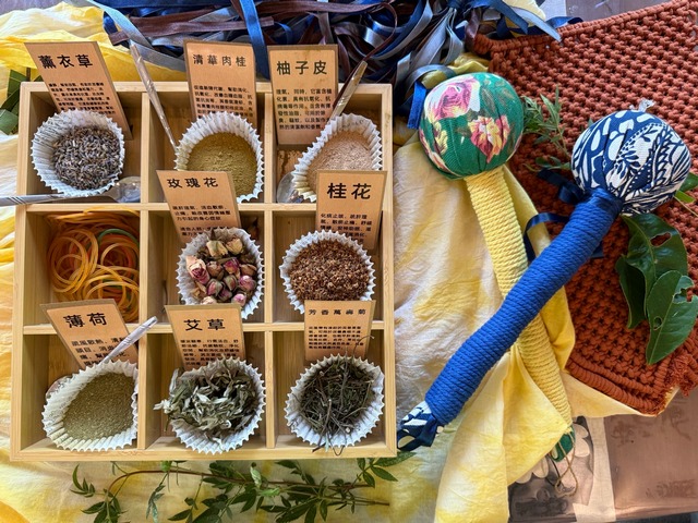 接續由玉芬示範教導現場學員動手製作香氛按摩搥,其作法是以艾草為主材,搭配自己所挑選出喜歡的藥材,兩者放入棉布中,再用棉線緊緊包裹、固定以後,即完成屬於自己的香氛按摩槌。透由草本植物的應用也學習到養生保健的技巧。