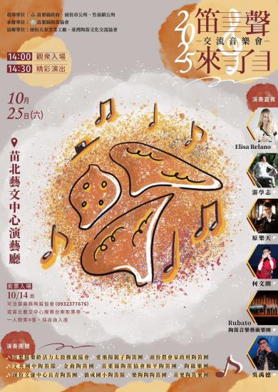 苗栗縣陶笛協會表示:活動呼應教育部「藝術與人文深耕」政策,期望透過跨國交流與在地團隊的舞台呈現,不僅提升學童藝術鑑賞與創作能力,也推動陶笛文化深植人心,讓苗栗成為國際藝術交流的重要舞台。誠摯邀請各方愛樂人士及鄉親們一同前來聆賞,感受一場美妙的音樂饗宴!有關演出訊息可洽苗栗縣陶笛協會/譚國榮總幹事 0932-377676或至苗栗縣政府文化觀光局網站http://www.mlc.gov.tw/藝文資訊/演藝活動查詢。