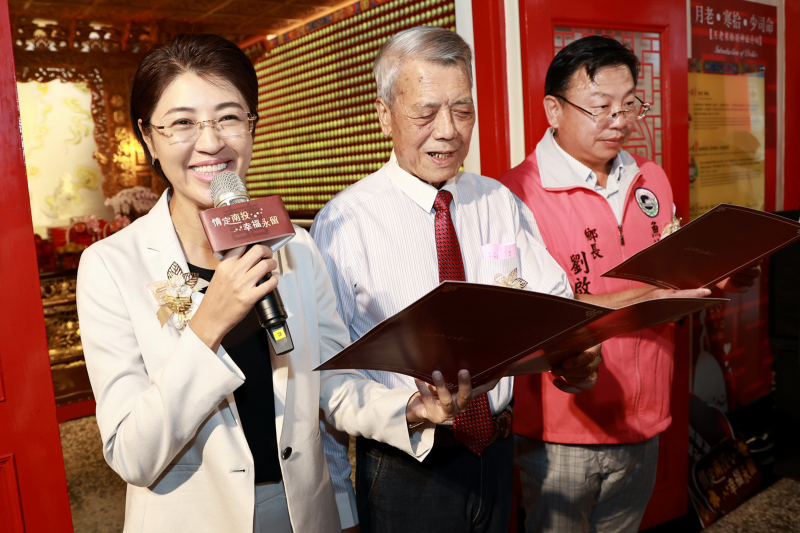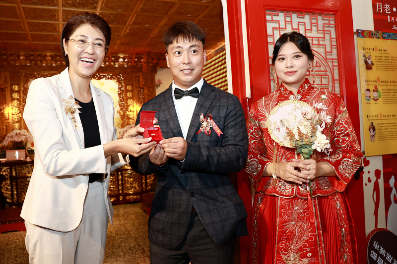 南投縣府17日在日月潭文武廟舉辦集團婚禮,30對新人在月老面前許下終身承諾,縣長許淑華到場見證,縣府貼心準備了由紫南宮土地公身上金牌所打造的「金戒指」,送給新人雙方的交換信物,希望能為每一對新人帶來平安富貴與長長久久的幸福。