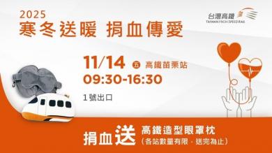 台灣高鐵公司為幫助各醫療院所度過每年歲末用血需求的高峰期,持續推動「寒冬送暖 捐血傳愛」公益活動,今年規劃自11月7日(五)起連續4個星期五,分別於高鐵南港總公司及沿線11個高鐵車站,舉辦12場巡迴募血活動。苗栗站則於11月14日星期五舉辦捐血活動,讓愛溫暖需要的人。