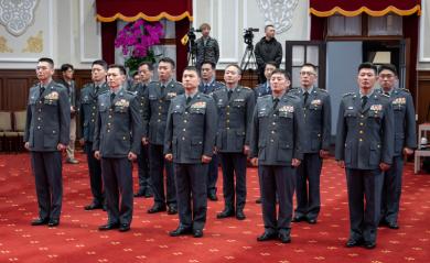 總統致詞表示,我要向所有榮升的將軍致上誠摯的祝福,也要向辛勤付出的寶眷表達深深的謝意,晉任象徵新的責任與新的起點,更代表國家對各位多年努力的肯定。期盼各位秉持初衷、持續精進,並打破形式主義的框架,帶領官兵專注於戰備訓練,提升組織效能。
