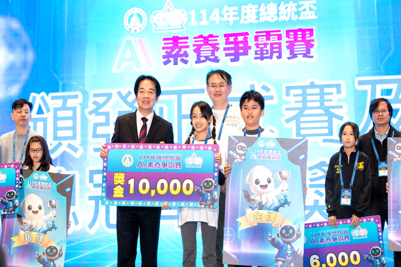 賴清德總統今(28)日下午前往臺南出席「114年度總統盃AI素養爭霸賽頒獎典禮暨閉幕式」,肯定臺灣年輕世代的科技潛力與創造力。並表示,政府正推動「AI新十大建設」與「晶創臺灣方案」,推升臺灣整體科技實力,並推動「一人一機」、生成式AI導入教學等策略,為臺灣帶來系統性的教育升級,落實「創新數位、普惠教育」,縮短城鄉差距。