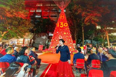 全紅的聖誕樹登場,國北教大11/27日舉辦「130向前走」校慶點燈祈福典禮,是國北教大及校友總會、億光文化基金會主辦,結合「雙春金蛇年」意涵,用5000多顆金銀紅聖誕球妝點,在絢麗天幕光影折射的璀璨燈海下展開,吸引上千師生及各界貴賓同來祝賀,成為歲末最夯最飆的浪漫風情!