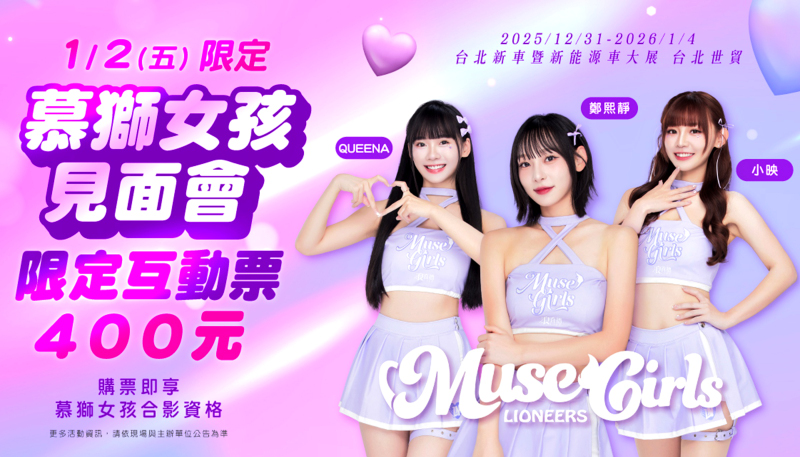 Muse Girls席捲車展!QUEENA、小映、鄭熙靜近距離合照開賣即完售,主辦單位將在1月2號特別邀請人氣啦啦隊Muse Girls(慕獅女孩)出席見面會現場,成員包括QUEENA、韓籍新成員鄭熙靜與在隊中相當受歡迎的小映。限量專屬互動票一開賣便秒殺完售。主辦單位表示,沒搶到票的粉絲也不必失望,現場仍能近距離見到三位人氣隊員,歡迎大家踴躍進場觀展,為心愛的偶像熱情應援。