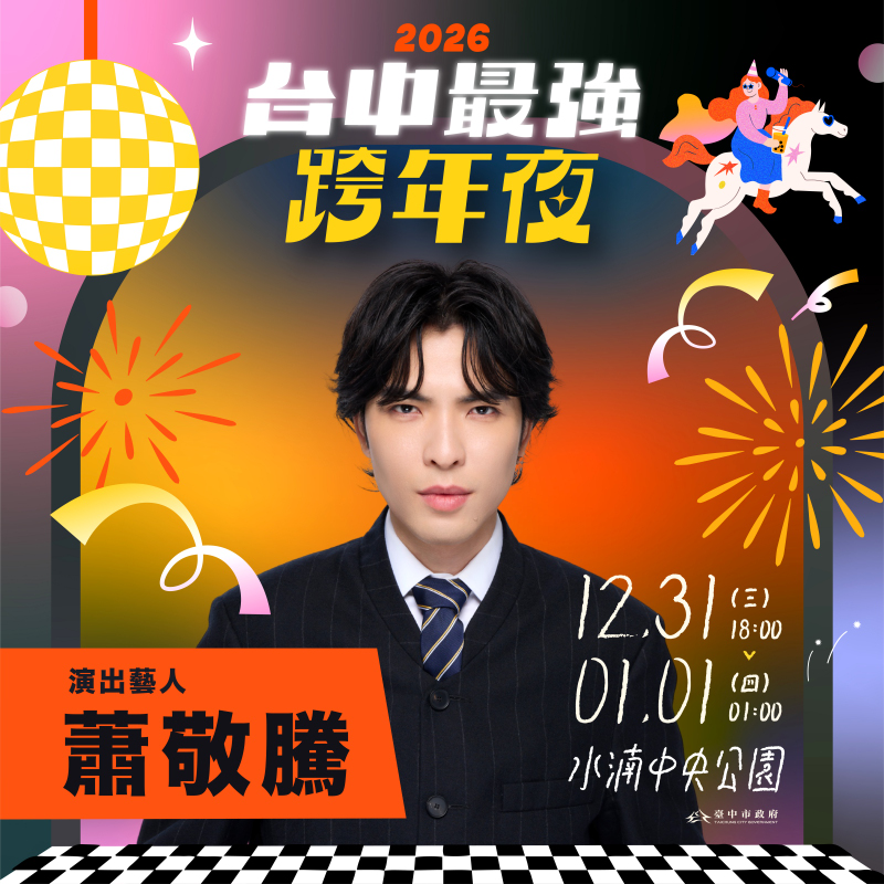 台中市府再度集結「全國含金量最高」的豪華卡司,由金曲歌王蕭敬騰領軍,集結三金滿貫歌王盧廣仲、經典天團動力火車、金曲天團告五人等16組重量級藝人輪番開唱,並於倒數時刻施放長達180秒的璀璨煙火秀,陪伴全國民眾迎接2026嶄新的第一刻。
