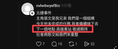 抓到了!台北車站19日發生隨機殺人事件後,有網民在Threads貼文指 「主角張文是我兄弟,我們是一個組織,他未完成的任務,會繼續接下去,下一個地點是高雄車站,敬請期待」,貼文被網友截圖引發社會高度恐慌,橋頭地檢署接獲情資後立即展開偵辦,於20日搜索並拘提1名陳姓男大學生到案,訊後認其涉嫌恐嚇公眾安全罪嫌重大,諭知以新台幣5萬元交保。