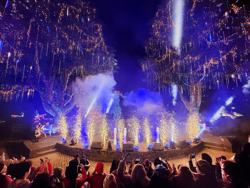 參山處表示,本次梨山場域最大亮點,為兩棵 高達 28 公尺的雪松 化身為「雲端上的耶誕樹」,透過冰柱燈與流星燈管交錯設計,模擬流星雨劃破夜空的動態光影,營造宛如銀河傾瀉、星辰躍動的視覺饗宴。燈光秀每 30 分鐘 演出一次,每場約 3 分鐘,讓旅客在靜謐高山中,定點欣賞限定星空聲光秀。廣場同時設置「喔熊的耶誕之約」燈飾,增添親子互動與節慶溫度,讓夜色更顯童話氛圍。