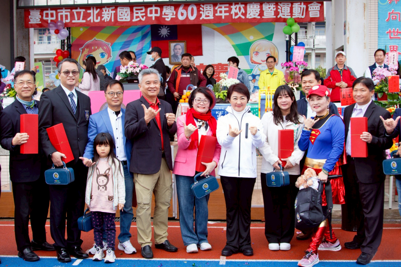 台中市立北新國中(27)日盛大舉行創校60週年校慶,現場嘉賓雲集、氣氛熱烈,親師生、校友、志工及社區夥伴齊聚一堂,共同見證北新國中一甲子的榮耀與傳承。市長盧秀燕也到場獻上祝福,她知道同學們都想趕快參加園遊會,也考量天氣寒冷,簡短致詞表示,祝北新國中生日快樂、校運昌隆,也祝福大家新年快樂。
