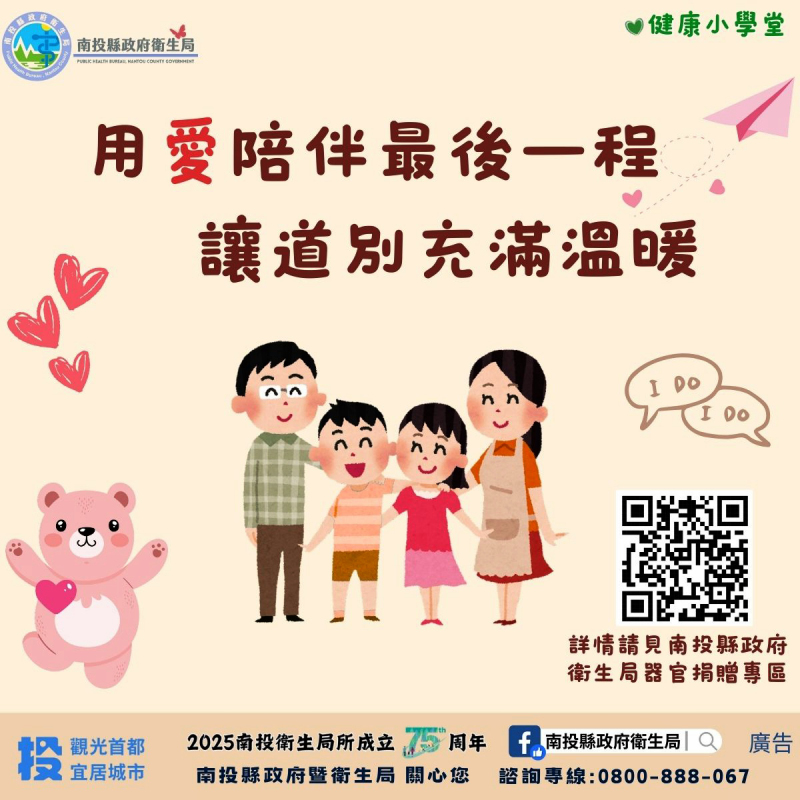 為讓社會大眾了解器官捐贈的程序與重要性,並促使民眾與家人及早溝通器捐意願,南投縣政府衛生局積極推動器官捐贈。透過簽署器官捐贈同意書,實踐「用愛陪伴最後一程,讓道別充滿溫暖」的理念,並對所有器官捐贈者與其家屬表達崇高的敬意。