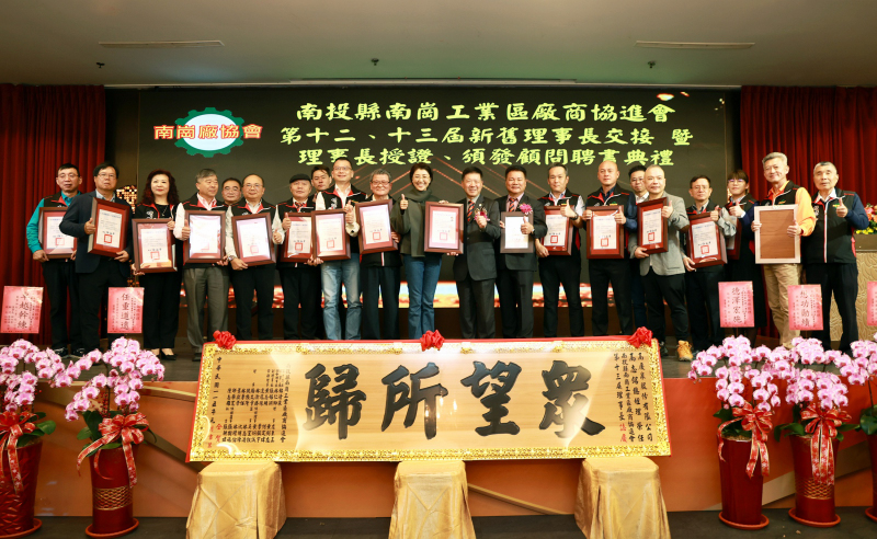 南投縣南崗工業區廠商協進會第12、13屆理事長交接典禮,23日在南投市南島婚宴會館盛大舉行。南投縣長許淑華出席祝賀,感謝卸任理事長粘清泉四年來對協會的卓越貢獻,同時期許新任理事長高志銘,帶領協會持續強化會員服務,協助產業因應國際貿易挑戰,積極朝智慧製造與低碳永續發展邁進。