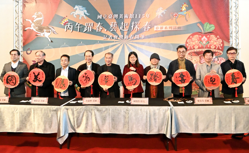 國美館今(24)日舉辦記者會暨新春開筆,由國美館長陳貺怡及李轂摩老師、施春茂老師、陳欽忠老師、林榮森老師、蕭世瓊老師、陳志聲老師、張志鴻老師、林俊臣老師、許志芳老師等9位知名書法家現場開筆祝福斗方,並現場揮毫祝賀春聯,傳遞馬年的期許祝福。當日並發送名家墨寶印製春聯,分別是國寶書畫家李轂摩老師、114年全國美術展書法類金牌獎許志芳老師之墨寶,供民眾限量索取。