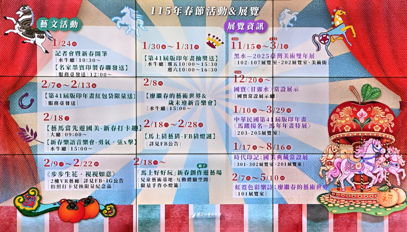 國立臺灣美術館誠摰邀請全民藝起探春、歡慶馬年!國美館自今(24)日起至元宵節,陸續推出「丙午躍春-藝起探春」春節系列活動,包含「新春開筆」、「名家墨寶印製春聯發送」、「版印年畫抽獎送活動」、「藝馬當先遊國美─新春打卡趣」、「新春樂語音樂會」、「FB猜燈謎」等,過年期間亦有「第41屆版印年畫:馬躍揚名–馬年年畫特展」、「虹霓色彩樂師:廖繼春的藝術世界」、國寶〈甘露水〉常設展示等重點展覽,邀請大家齊聚國美館,在藝術與歡樂中迎春賀歲。