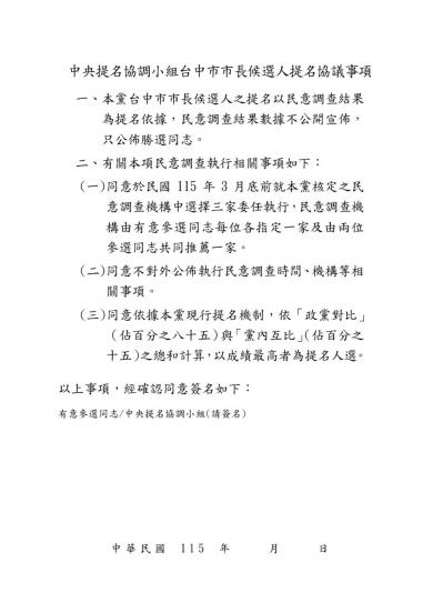 國民黨台中市長提名整合卡關,黨中央下午表示,確定於3月25至31日完成民調作業,但遭立法院副院長江啟臣質疑違背雙方協議。江啟臣辦公室提供江啟臣表示,基於尊重黨中央,於第一時間收到中央提名協調小組台中市長候選人提名協議事項,即行簽署同意並回傳黨中央,但黨中央發布訊息稱「擬於3月底前的最後一週(3/25至3/31)完成民調作業,已違背協議。
