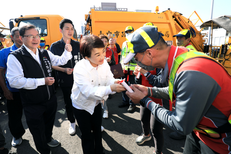 農曆春節將至,家家戶戶忙著除舊布新、迎接新年,也是清潔隊員一年當中最繁忙的時刻。市長盧秀燕今(14)日年假第一天特地前往南屯區清潔隊,親自向堅守崗位的第一線清潔人員表達關懷與感謝,並致贈加菜金新台幣20萬元,向環保英雄致上最誠摯謝意:「加油,謝謝,新年快樂!」