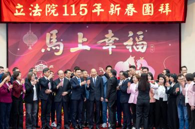 韓國瑜院長(24)日上午出席立法院115年新春團拜活動,現場貴賓包含江啟臣副院長、國民黨黨團傅崐萁總召、民進黨黨團柯建銘總召、台灣民眾黨黨團陳清龍總召及各黨委員、周萬來秘書長、張裕榮副秘書長及各單位主管、同仁共襄盛會,現場布置喜氣洋洋,並以「鼓舞連環」表演揭開序幕。