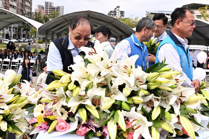 今日追思會在聞韶軒絲竹室內樂團與卡斯莫樂團悠揚樂聲中揭開序幕。盧市長帶領民眾默哀一分鐘,並與受難者家屬及來賓一同施放象徵希望的和平鴿氣球,隨後在紀念碑前獻上白百合,透過莊重而溫暖的祈福儀式,緬懷過去、撫平傷痛,也期勉社會珍惜前人努力爭取的民主自由,凝聚力量,持續展現台灣的韌性與團結。