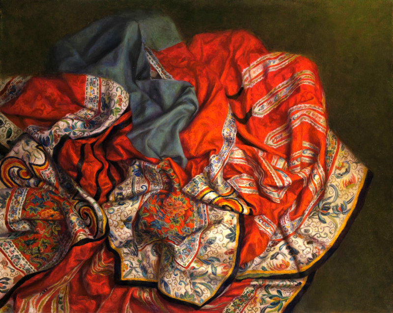陳香伶去年二月底曾帶著作品「烈愛」遠渡重洋來到法國巴黎參加由法國文化部、法國國家博物館、巴黎市政府、四大藝術沙龍等單位共同發起的的國際年度藝術盛事「首都藝術展」。「烈愛」畫作,延續了她一貫以「清代刺繡絲綢」為符號的創作語彙,以極致細膩的寫實技法,探討現代女性在傳統與自我間的反思與覺醒,透過這件畫作勾勒女性在婚姻角色中的定位,繡面上象徵祝福與祈願的吉祥圖騰卻也隱涵傳統父權對女性的束縛。