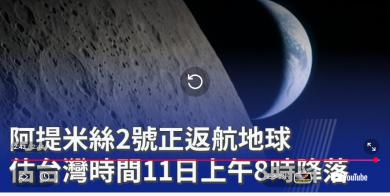 1972 年阿波羅 17 號以來,人類離地最遠紀錄40萬公里的阿提米絲2號任務的4名太空人,目前正在返航地球的途中,他們搭乘的獵戶星座號太空船,預計台灣時間11日早上8時7分,降落在加州聖地牙哥外海。這趟任務除了創下許多第一的紀錄,也因為組員們帶了先進的攝影器材,沿途拍下了許多令人讚嘆的影像,並即時傳回地球。