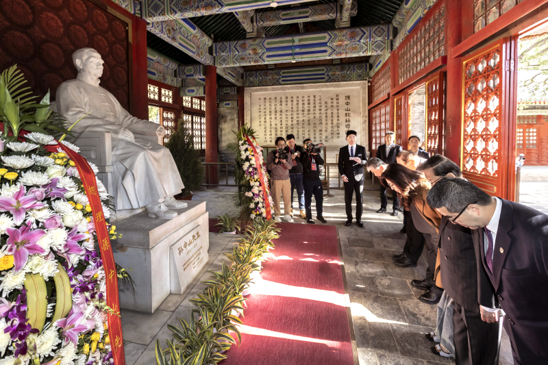 訪問團一行上午步入碧雲寺內所設的孫中山紀念堂,對紀念堂中的孫中山先生漢白玉全身塑像行三鞠躬禮,兩旁擺放的花圈緞帶上書寫「總理孫中山先生靈鑒」,落款「中國國民黨主席鄭麗文暨全體同志敬獻」。