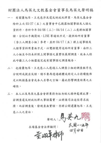 一、有關蕭旭岑、王光慈涉及違反財政紀律案,馬英九基金會除於上次03/27(五)之董事會中已揭露相關事證及人證之資料外,亦於今年04/08(三)、04/14(二)二度將相關事證,分別以手機簡訊、LINE等通訊方式,提供給所有董事(含三人調查小組)參考。並於04/17(五)將上述事證及人證等資料用書面方式,以雙掛號寄送給所有董事,由於三人小組至今仍未針對上開事證之真實性展開調查,故本人特此呼籲三人小組儘速完成有關事證之調查報告。