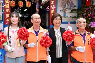 縣議員凃淑媚議員代表致詞,感謝大家這幾年來的努力,不管是中央、縣府還是議會,都全力支持古蹟修護,從一開始脫落斑駁的狀態,經文史工作者的專業修護,才漸漸呈現出今天的樣貌,可說是為地藏王廟上新妝。
