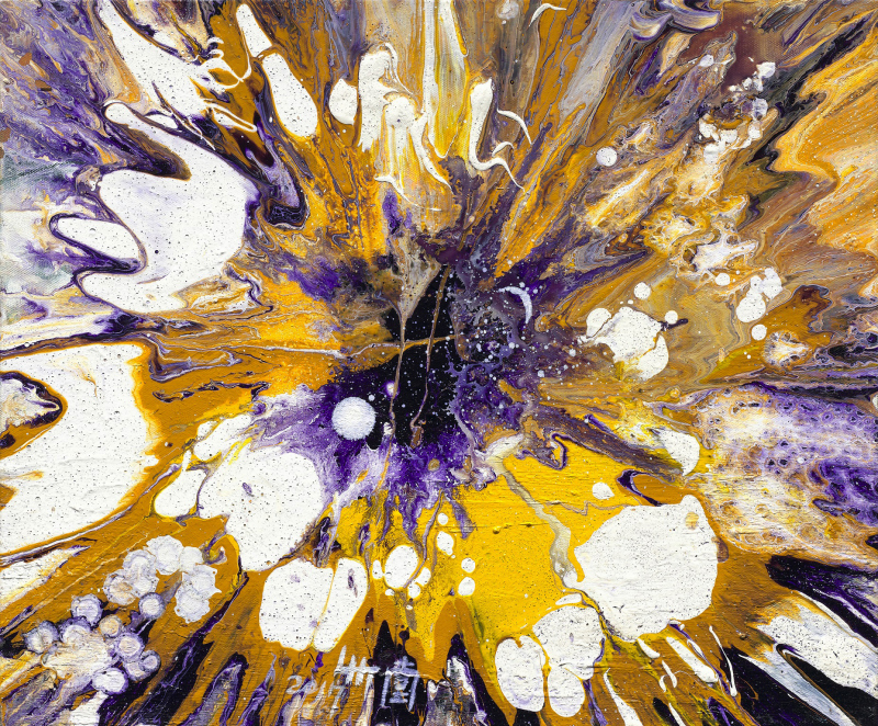 由對環境議題、自然現象的關注,逐漸轉向對宇宙、未知的探問。也因為喜愛天目之美,藝術家進而在繪畫上研究天目釉色變化,用微觀的方式,將天目放大;以油彩的質感,表現天目的璀璨繽紛。林輝堂表示,將陶瓷釉料放入畫布具有一定難度,而藝術家藉由速度和水分的控制,選擇讓顏色之間相互自然碰撞的方式,用作品叩問宇宙未知的探索,創作「曜變‧躍變」的畫布上的天目。