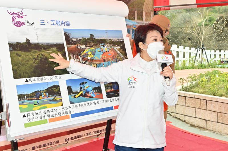 龍井區長戴燕如說明,衛福部去年8月修正「兒童遊戲場設施安全管理規範」,規定兒童遊戲場的材料、設計、製造、安裝、檢查及維護都要符合法規和國家標準,但檢驗廠商、人員少,「鯉魚山公園」原今年3、4月才能檢驗完成,感謝市府協助,能提前於去年12月檢驗完成,今年順利啟用,建構符合民眾遊憩、健身的休閒運動場域。