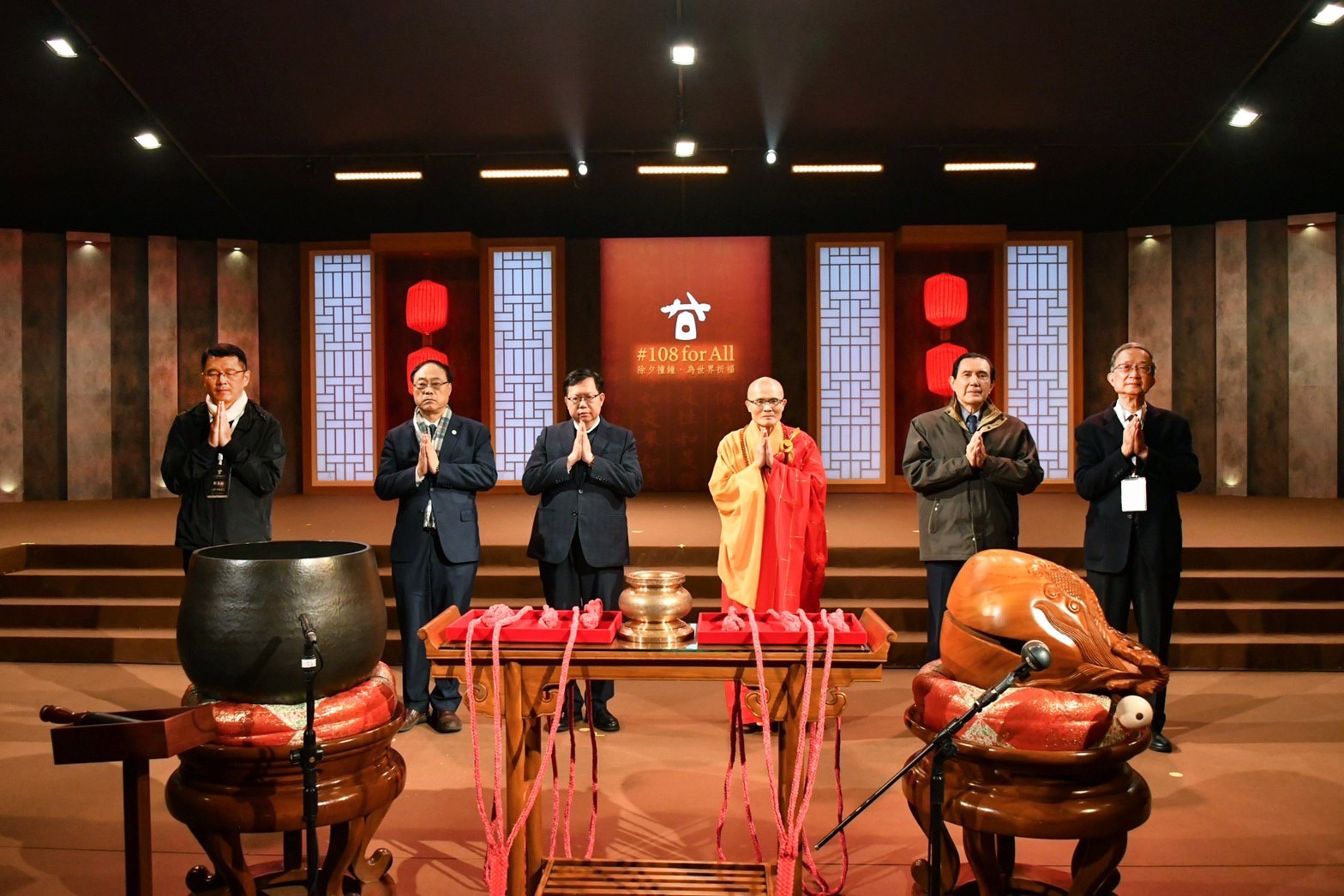 法鼓山除夕撞鐘共108響,象徵去除108種煩惱。今晚前總統馬英九、行政院副院長鄭文燦等各界嘉賓,將與方丈和尚共同圓滿第106響~108響,並在大年初一凌晨時分,齊心為國家、社會與民眾獻上誠摯的新年祝福,願人人許下幸福好願,邁向龍年好幸福。(法鼓山提供)