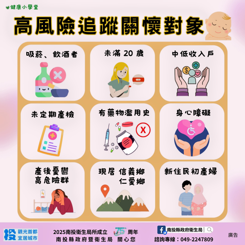 歡迎民眾透過孕產婦諮詢專線(0800-870-870)、孕產婦關懷LINE官方帳號(https://ntshb.tw/hc01TRbyB)、孕產婦關懷網站(https://ntshb.tw/hc01xBFAE)、南投縣幼兒專責合約醫療院所名單(https://ntshb.tw/nth01vR7fe)或兒童發展聯合評估中心聯絡資訊連結(https://ntshb.tw/nth01EA3uy)獲得更多資訊與協助。