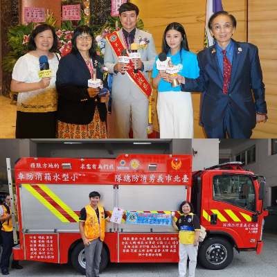 圖:圖中為金剛獅子會洪啟恩會長暨石英雀會長交接典禮,暨前會長黃秋梅獅友,也是現任GLT協調長、前行銷長、前宏獅雜誌社長(右五)暨黃桎橋第一副會長(右二),接受媒體聯訪合影。下圖為捐贈小型消防水箱車。(圖/劉永富攝)