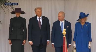 川普總統與第一夫人梅蘭妮亞·川普(Melania Trump)星期二(9月16日)晚間抵達英國。在倫敦過夜後,他們搭乘直升機前往倫敦郊外的溫莎城堡。威廉王子和他的妻子威爾斯王妃凱特首先迎接了他們,隨後國王查爾斯和王后卡米拉出面舉行了正式歡迎儀式。