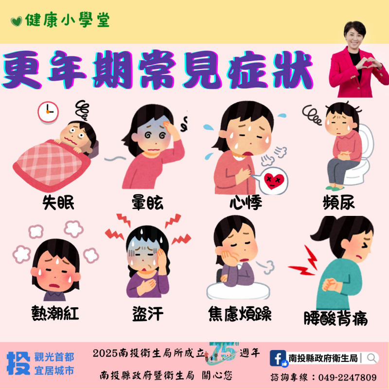 衛生局長陳南松指出,更年期為自然的人生階段,並非疾病。若能透過日常生活方式醫學的實踐與自我健康管理,不僅可減少慢性病風險,亦能在身心調適中培養自信與幸福感。在「2025世界更年期關懷日」之際,衛生局也呼籲民眾關注更年期健康,從日常生活中實踐生活醫學,將健康行為內化為生活習慣,並透過理解與陪伴,共同營造健康宜居、熟齡友善的南投。