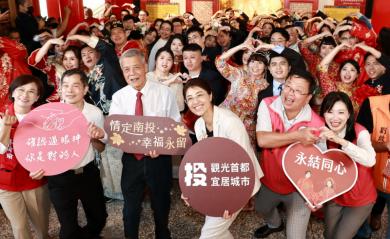 南投縣府17日在日月潭文武廟舉辦集團婚禮,30對新人在月老面前許下終身承諾,縣長許淑華到場見證,縣府貼心準備了由紫南宮土地公身上金牌所打造的「金戒指」,送給新人雙方的交換信物,希望能為每一對新人帶來平安富貴與長長久久的幸福。