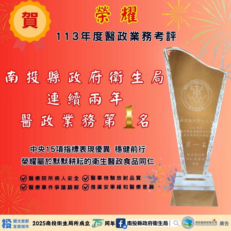 賀! 南投縣政府衛生局榮獲衛生福利部「113年地方衛生機關業務~醫政業務第一名」