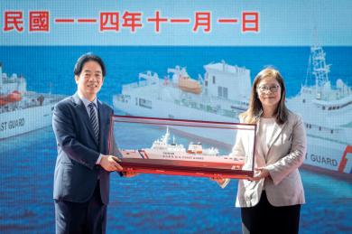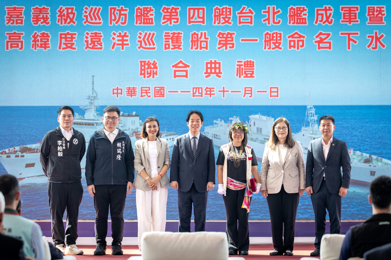 賴清德總統(1)日上午出席「嘉義級巡防艦第四艘台北艦成軍暨高緯度遠洋巡護船第一艘命名下水聯合典禮」,展現政府持續推動「國艦國造」與「國防自主」的成果。並表示,面對中共的灰色地帶侵擾,臺灣除強化自身防衛、深化與理念相近國家的海事合作外,也要強化國家數位及民生運作的韌性。期盼立法院不分黨派,支持「海纜七法」的修法,確保臺灣在通訊、能源、民生及航運的穩定運作,也一起為海洋治理與國家安全貢獻力量,共同守護民主、自由與和平。