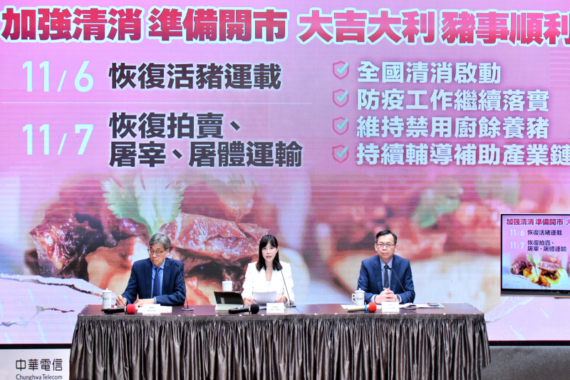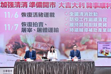 今(6)日中午可恢復活豬運輸、11月7日凌晨零時起恢復毛豬拍賣、屠宰、屠體運輸及零售交易。為避免長時間休市所造成的毛豬供需失衡,請農業部審慎執行落實產銷調節措施,務必要穩定市場秩序及價格,保障豬農收益及消費者權益。