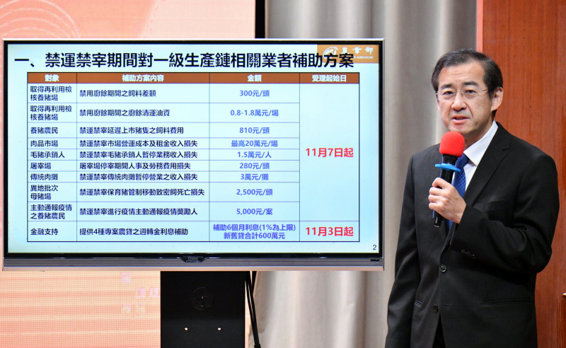 10月21日檢驗出首例本土非洲豬瘟案例,隔日非洲豬瘟中央災害應變中心就陸續啟動三個階段應變及防疫精進措施,第一時間在臺中設立中央前進應變所,組成了中央疫調小組並派遣國軍化學兵,全力協助臺中市政府進行疫調及落實清消等工作。