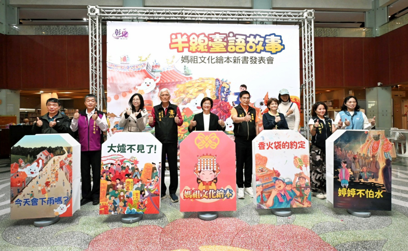 彰化縣文化局今(20)日在縣立圖書館辦理「半線臺語故事繪本新書發表記者會」,縣長王惠美、繪本作者、繪者及各宮廟主委等人與會。王縣長表示,為讓大眾更認識彰化的「媽祖故事」,特別邀請在地作家與著名插畫家共同創作,以彰化縣無形文化資產的媽祖民俗文化慶典為主題,出版4本精彩繪本。