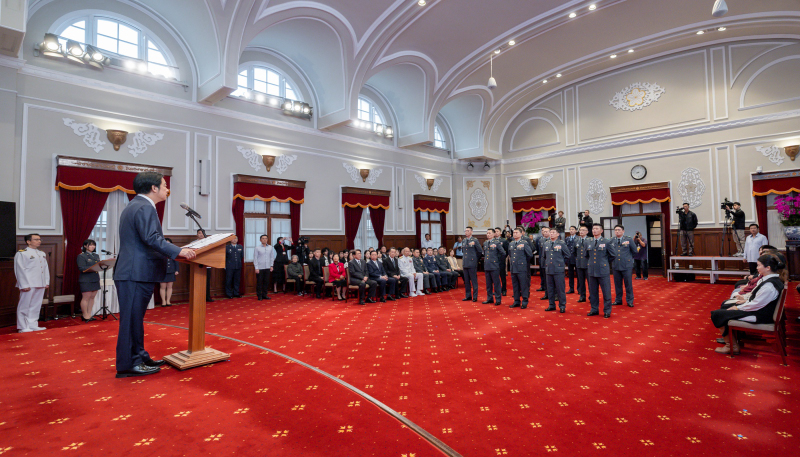 賴清德總統今(25)日上午主持「中華民國114年12月份將官晉任授階典禮」,強調面對威權主義的擴張與科技的快速發展,必須持續發展不對稱戰力,除陸續籌獲 M1A2T 戰車等先進裝備,也將加速打造「臺灣之盾」,讓防衛更具深度與韌性;同時精進戰術戰法,改善資通電作業環境與設備,讓整體戰力更具機動性、彈性與嚇阻效益。期許打造國軍為更現代化、可恃且有效的防衛力量,確保國家安全與人民的福祉。