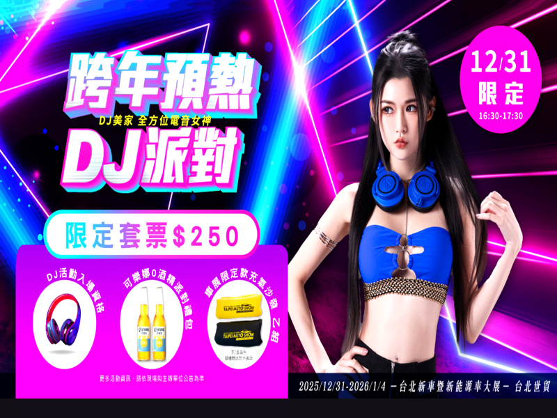 跨年看車也能嗨翻!2026台北車展首度推出「DJ女神派對」,2026台北新車暨新能源車大展將於12月31日推出一日限定「跨年 DJ 派對」限定活動,打造全台唯一看車展、拿好禮、嗨跨年的盛大跨年新體驗!今年主辦單位首度與電音女神合作「DJ美家」,限量推出的「跨年 DJ 派對限定活動票」,只要250元(不包含車展入場票)即可擁有跨年DJ派對活動參與資格,並可獲得一份指定活動限定禮品。車展現場打造沉浸式舞台,讓觀眾在閃耀車款與震撼電音中一起暖身開跑、一路嗨到跨年倒數現場,提前引爆2026年的第一波狂歡熱潮,詳情請上官網查詢。