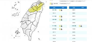 黃色燈號(寒冷)部分︰新北市、基隆市、桃園市、新竹縣、苗栗縣、宜蘭縣有10度以下氣溫發生的機率。
