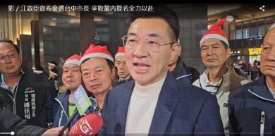 江啟臣與台灣新世代關懷協會,14日晚間在台鐵豐原車站前廣場,舉辦耶誕音樂會活動。針對媒體詢問在路口架設廣告看板,是否要參選台中市長,江啟臣表示,歲末年終是祝福與感恩季節,掛看板一方面祝福市民新年快樂,並感謝一路的鼓勵與支持,看板標語「駿馬啟新城,躍進旗艦城」,也是他對台中的願景與期望。