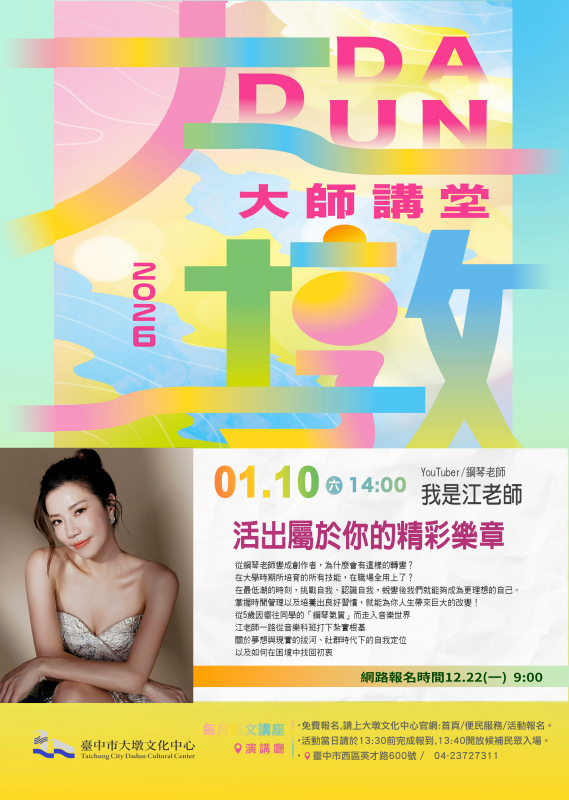 臺中市大墩文化中心將於 115 年 1 月 10 日(星期六)下午 2 時舉辦「大墩大師講堂」,特別邀請擁有近 65 萬訂閱、深受年輕族群喜愛的音樂型 YouTuber—「我是江老師」擔任講座嘉賓,以〈活出屬於你的精彩樂章〉為題,分享她從古典音樂科班、鋼琴老師,到成為知名內容創作者的心路歷程,帶領觀眾重新思考「自我定位、勇氣與成長」。