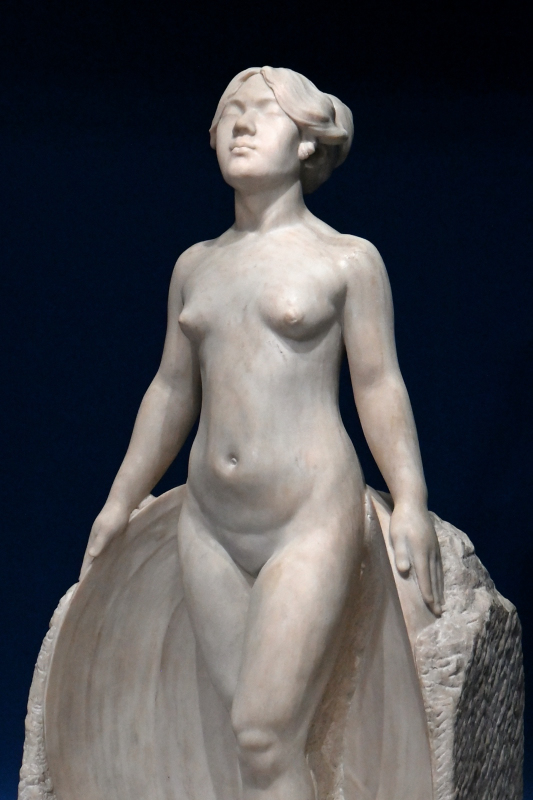 〈甘露水〉是黃土水1919年的創作,於1921年入選日本「帝國美術展覽會」第3回,在當時,即便日本雕刻界也少有以女性裸體為主體的作品。這件與東方女性約等身的大理石雕作品,頭部仰起、眼睛微閉、雙腿交叉站立,雙臂微張輕撫背靠底座的儀態,展現了堂堂自信的迎向陽光或雨露潤澤的儀態。