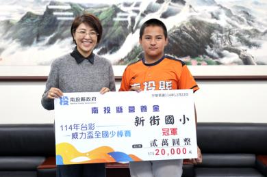 許縣長說,南投縣少棒代表隊擊敗列強,為本縣少棒史增添一座冠軍獎盃,此次代表隊以新街國小棒球隊為主,加上中正國小及千秋國小小將一起組隊參加2025台彩威力盃全國少棒賽,在總教練調度運籌下,於全國22隊精銳球隊中突圍晉級八強,並成功搶進冠軍賽,面對來勢洶洶尋求連莊的桃園市隊,小將們面對強敵,毫不怯弱,在教練指導下,發揮團隊精神,沉穩應敵,最終以5比0完封勁敵桃園市隊,勇奪隊史首座冠軍及新臺幣100萬元獎金 ,相當難能可貴,更是南投人的驕傲。