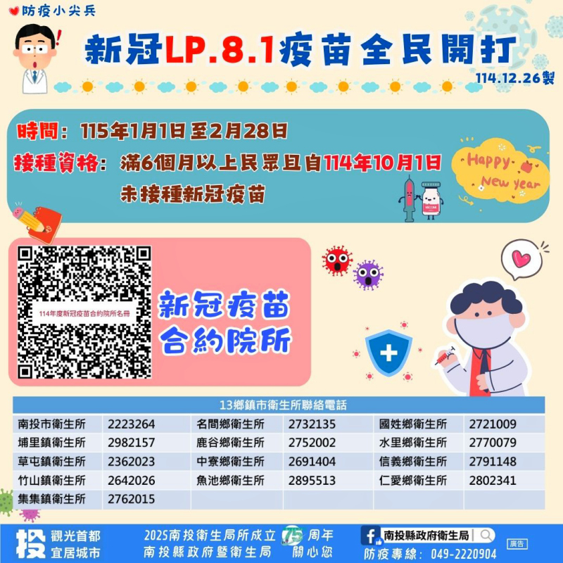 近期氣溫下降及後續春節連續假期期間返鄉、旅遊與聚會人潮頻繁,新冠病毒傳播風險增加,新冠併發重症疫情恐有升溫之虞。疾病管制署宣布,自115年1月1日起至2月28日,擴大提供新冠疫苗接種公費對象為「滿6個月以上尚未接種之全民」,縣府呼籲民眾踴躍接種,以提升整體免疫保護力,降低感染後病發重症及死亡風險。