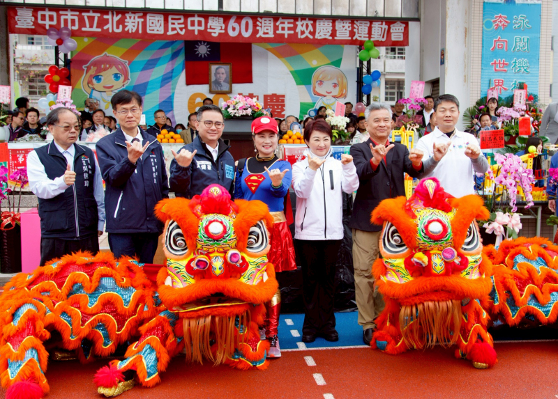 台中市立北新國中(27)日盛大舉行創校60週年校慶,現場嘉賓雲集、氣氛熱烈,親師生、校友、志工及社區夥伴齊聚一堂,共同見證北新國中一甲子的榮耀與傳承。市長盧秀燕也到場獻上祝福,她知道同學們都想趕快參加園遊會,也考量天氣寒冷,簡短致詞表示,祝北新國中生日快樂、校運昌隆,也祝福大家新年快樂。