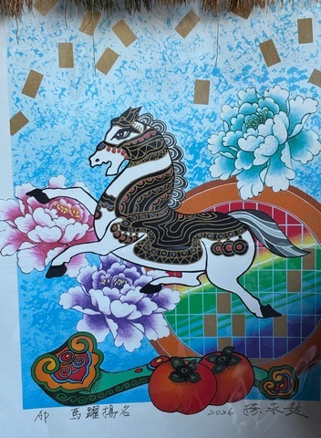 丙午馬年將臨,這幅馬躍揚名版畫象徵~馬上成功,金錢從天而降,牡丹花開富貴,喜事連連,柿柿吉祥,如意心想事成。