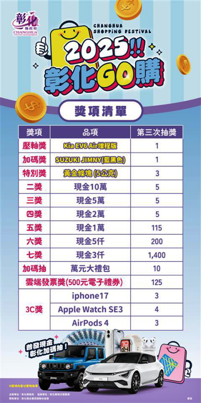 「2025彰化GO購」消費抽獎活動,今(7)日於縣府中庭舉辦第3次抽獎直播記者會,彰化縣長王惠美與會。在律師及縣府政風處全程見證下,公開抽出1,880位幸運得主,去年受惠於設計展盛況與中央普發現金一萬元的雙重利多,成功帶動全台民眾湧入彰化,消費熱度超乎預期,本次SUZUKI JIMNY汽車得主在和美加油600多元就幸運抽中,最大獎Kia EV6 Air增程版電動車得主則是購買Gogoro,為這場為期數月的消費拚經濟活動畫下圓滿句點。